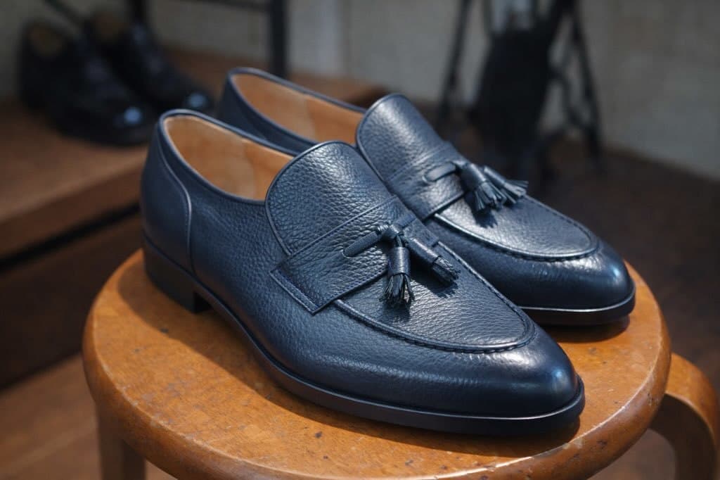 ソフトなネイビーカラーのシボ革を使い、足あたりも良く仕上げました